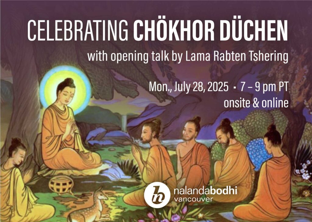 On Monday, July 28, we will celebrate Chökhor Düchen, a significant Buddhist holiday and one of the four Düchens or “Great Occasions.” Our resident Canadian teacher, Lama Rabten Tshering, will preside over an onsite and online program beginning at 7 pm Pacific, concluding around 9 pm. Lama Rabten’s opening remarks and the ensuing liturgical practice will be in English.