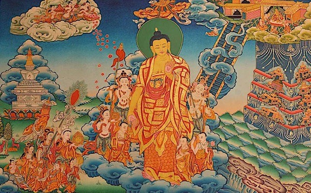“Lha” means god and “bab” means descent. The celebration of Lhabab Düchen commemorates Buddha’s descent from the heavenly realm of Tushita back to the human realm. The Buddha went to Tushita heaven to teach his mother, Mayadevi, who passed away seven days after his birth and was reborn among the pure realms. To repay her kindness, to liberate her and benefit the gods, Buddha spent three months teaching Abhidharma in Tushita Heaven. Then as the gods bowed to him, he descended to earth to continue teaching the dharma in the human realm.